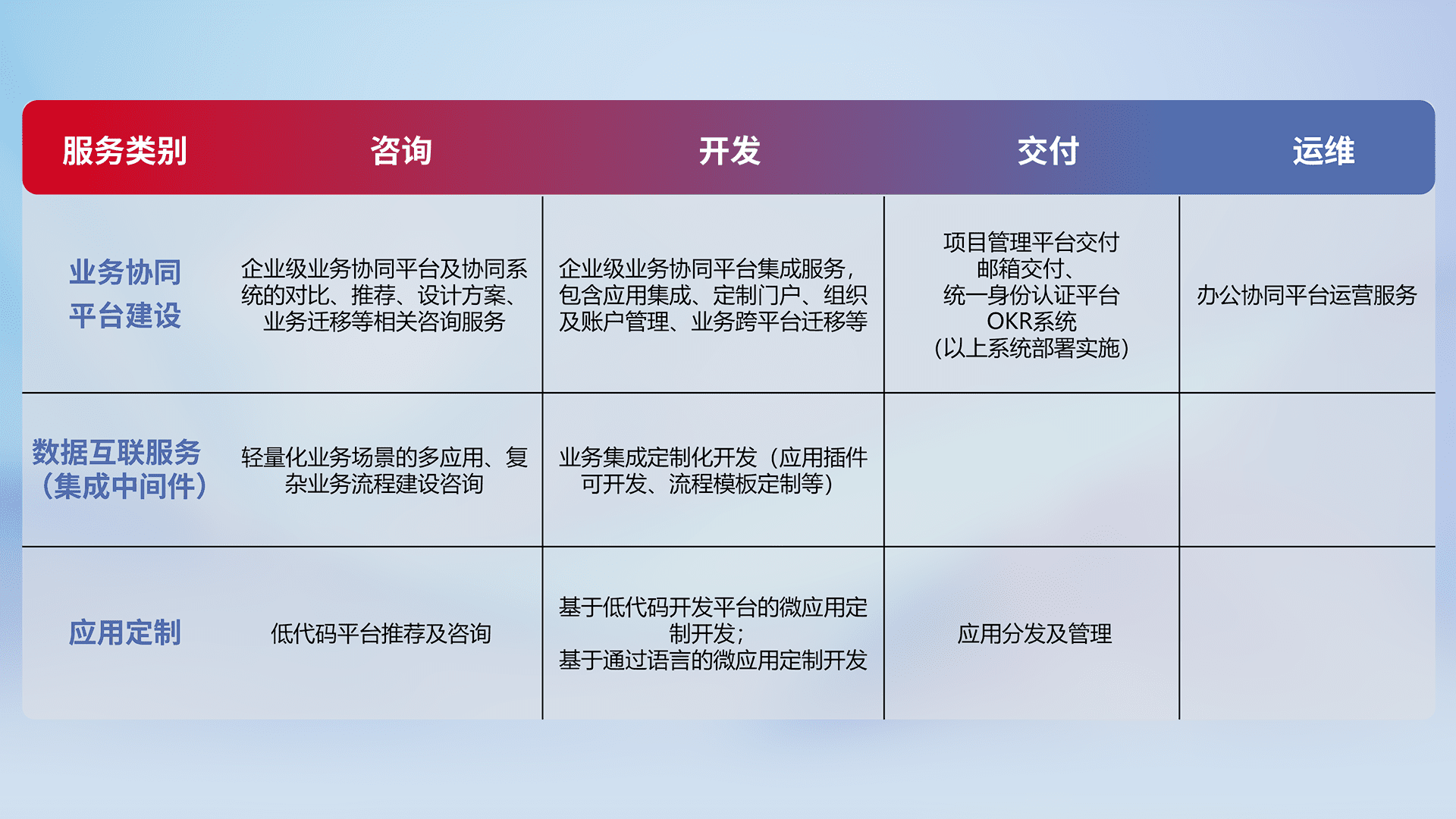 针对钉钉、、企微、、IDaas等平台级产品提供产品的规划、、、、方案、、、、交付、、、定制化开发等服务,,实现如统一协同办公、、、智能客户服务、、、、混合会议管理、、智能数据查询、、等业务场景,,实现数字化转型。。。。