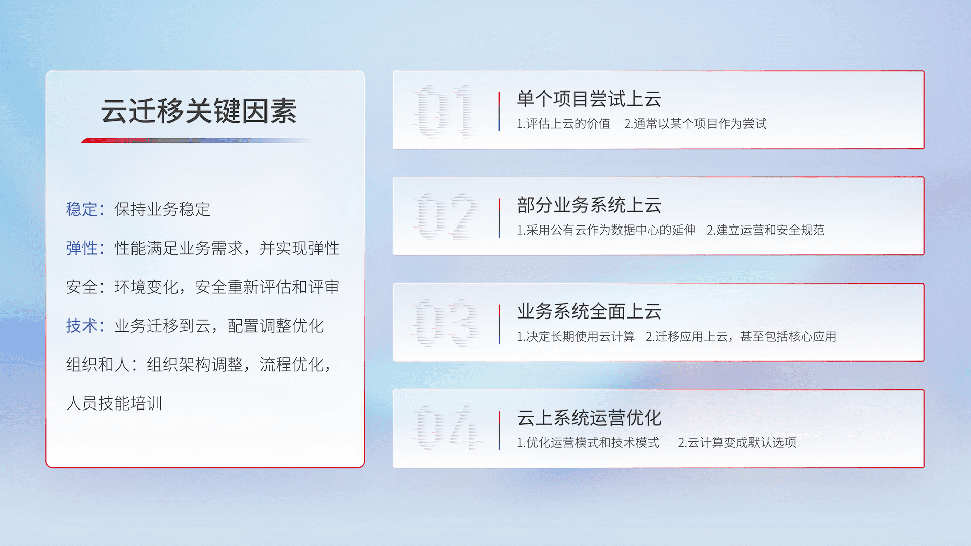 结合实际业务,,,,从规划设计、、云平台选型、、、云原生改造、、、、数据迁移、、、、集成交付,,,迁移全过程为客户识别最佳上云路径,,做好风险识别管理,,,设计网络架构、、身份权限、、安全审计合规、、、操作审计、、、、日志审计、、监控告警策略、、、多站点容灾设计等,,,,对云上基础设施进行整体规划,,提升IT治理水平,,,以满足弹性、、、、高可用、、、高性能的需求。。。