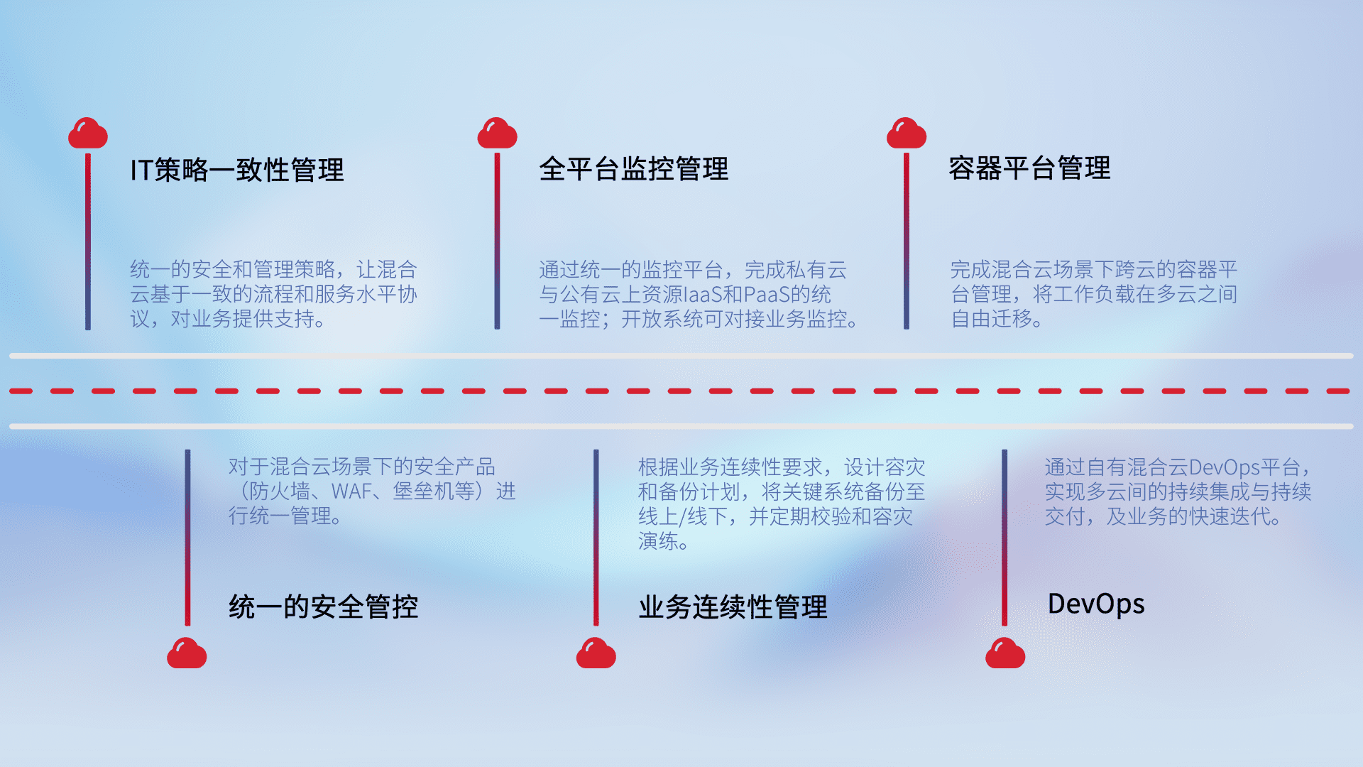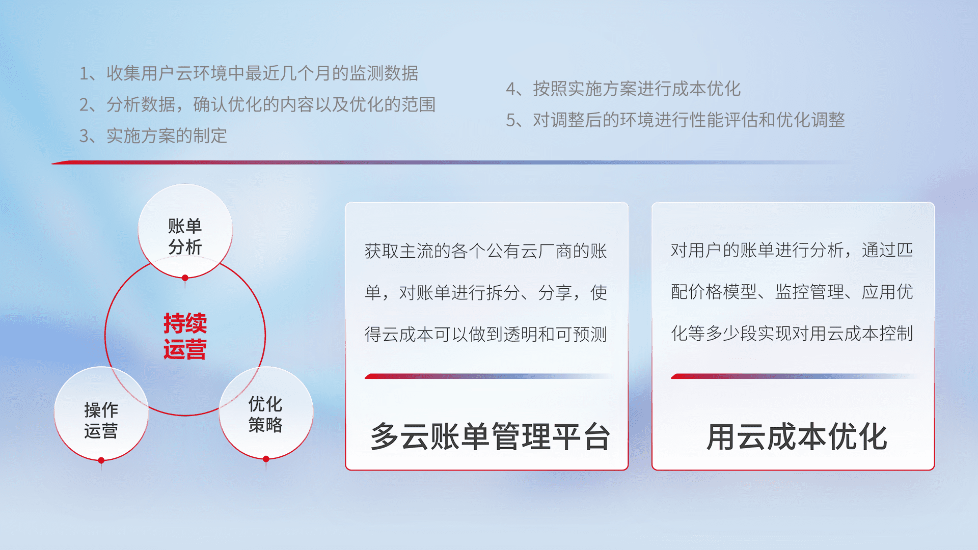 通过多云纳管,,以统一的资源数据模型把客户的云资源进行抽象和封装,,,进而实现对多云资源的统一操作,,,保障云资源管理的可靠性、、稳定性与可用性。。量身定制化运维内容,,,配置、、、开发运维、、补丁管理、、备份、、监控、、、认证和访问管理、、、、审计和日常巡检等,,保障在用云过程中的可靠度,,,稳定度以及高可用率。。